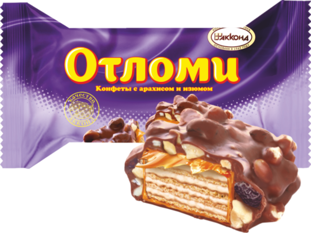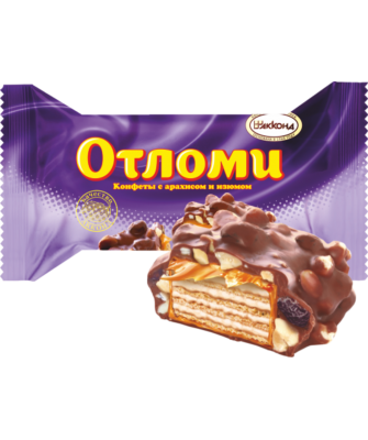 Глазированная вафельная конфета с изюмом и обжаренной крупкой арахиса XXL. Новый вкус. Меньше сахара, больше отборного изюма. Источник энергии и позитива. Упаковка флоу-пак. Конфеты "Отломи" имеют диплом l степени "За высокое качество продукции" и золотую медаль конкурса "Продукт года-2019"