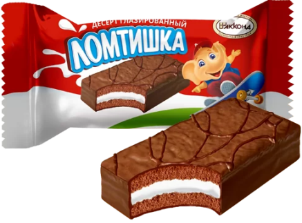 Нежные бисквитные ломтики со сливочной кремовой начинкой покрыты и декорированы шоколадной глазурью. Неповторимый вкус детства!!! Упаковка флоу-пак. Десерт «Ломтишка» награжден золотой медалью конкурса "Лучший продукт-2020", серебряной медалью конкурса «Продукт года-2019», диплом 1 степени «За высокое качество продукции» в 2018 году и ГРАН-ПРИ конкурса «Лучший продукт» в 2017 году