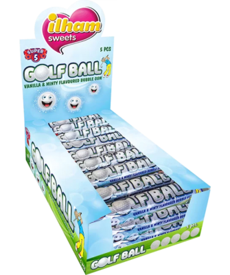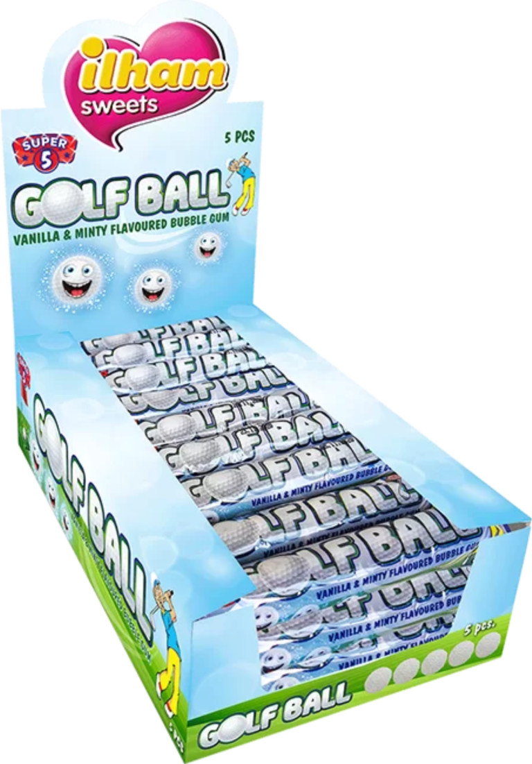 Жевательная резинка в виде мячей для гольфа со вкусом ванили и мяты. Поставляется в шоу-боксе блистерами по 5 шт.
