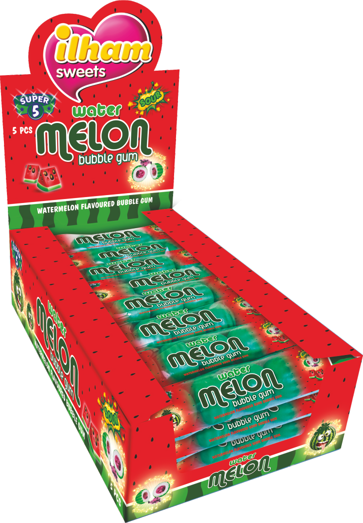 Жевательная резинка со вкусом кислого арбуза. Поставляется в шоу-боксе блистерами по 5 шт.