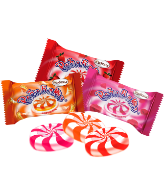 Микс из трех видов двухцветной карамели из сочетания вкуса натуральных сливок с апельсином, малиной и земляникой. Упаковка флоу-пак