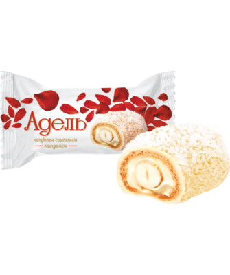 Нежнейшая хрустящая вафельная конфета в белой глазури с обсыпкой кокосовой стружкой и кремовой сливочной начинкой с цельным миндальным орешком внутри. Конфеты «Адель» имеют золотую медаль конкурса "Лучший продукт-2020" и диплом лауреата конкурса «Лучший продукт» и ГРАН-ПРИ в 2019 году