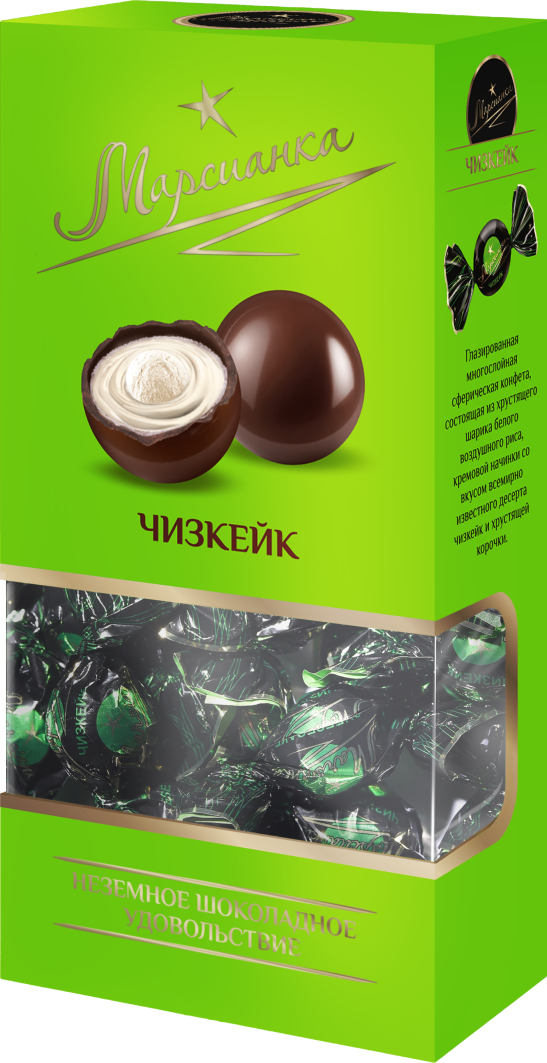 Конфеты с глазурью из темного шоколада, хрустящим корпусом из карамели, нежнейшим сырно-творожным кремом с тонким ароматом ирландского сливочного ликера и шариком из хрустящего воздушного белого риса внутри. «Марсианка» - концептуальный продукт фабрики. Его уникальность заключается в многослойности и вариациях вкусов. Покрытая глазурью идеальная сфера с хрустящим ядром и нежной начинкой – безупречное сочетание, которое делает эти конфеты поистине неземным удовольствием. При создании «Марсианки» кондитеры вдохновлялись вкусами мировых десертов – шедевров кондитерского искусства