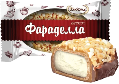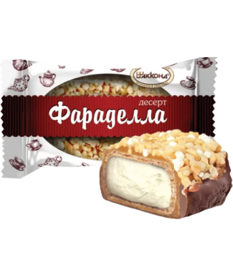 Вафельный хрустящий корпус с глазированным молочным шоколадом донышком покрыт карамелью, воздушным рисом, дробленым арахисом и скрывает нежнейшую кремовую сливочную начинку из цельного сгущенного молока. Эксклюзивный продукт!!! Упаковка флоу-пак. Десерт «Фараделла» имеет диплом лауреата конкурса «Лучший продукт» и ГРАН-ПРИ в 2018 году