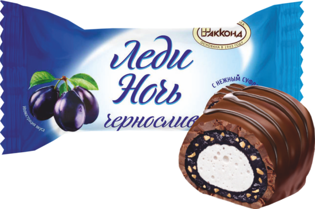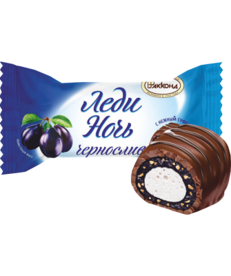 Эксклюзивная конфета на основе воздушного сливочного суфле и чернослива покрыта глазурью из темного шоколада с декором. Сделана по эксклюзивной технологии! Натуральные фрукты. Упаковка флоу-пак. Сделана по ГОСТ. Конфеты «Леди Ночь» имеют Гран-При и Золотую медаль "За высокое качество продукции» в 2017 году и «Знак качества XXI века» в 2005 году