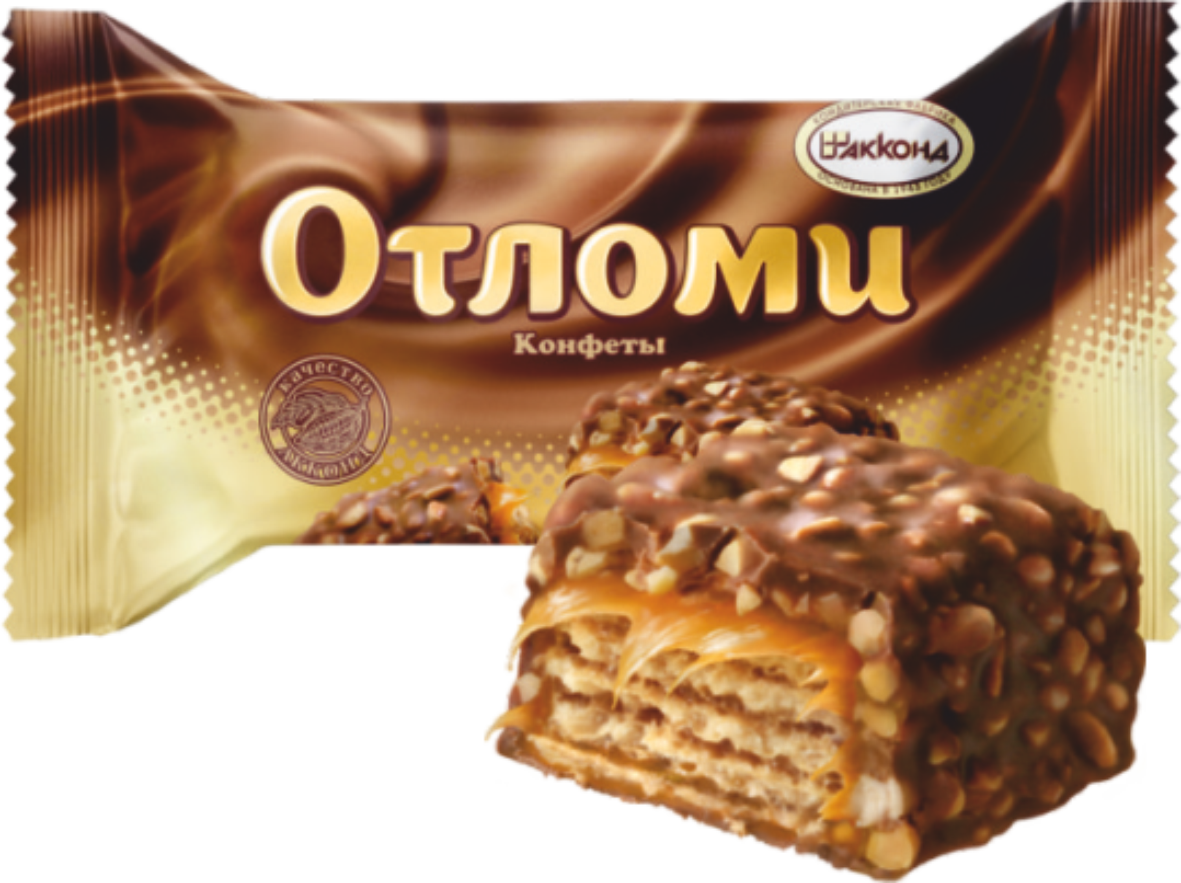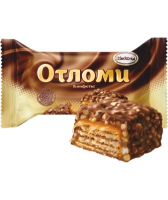 Оригинальная глазированная молочным шоколадом девятислойная вафельная конфета с молочной карамелью и кремовой начинкой посыпана воздушным рисом и жареным арахисом. Упаковка флоу-пак. Конфеты «Отломи» имеют диплом l степени «За высокое качество продукции» и Золотую медаль конкурса "Продукт года-2019"