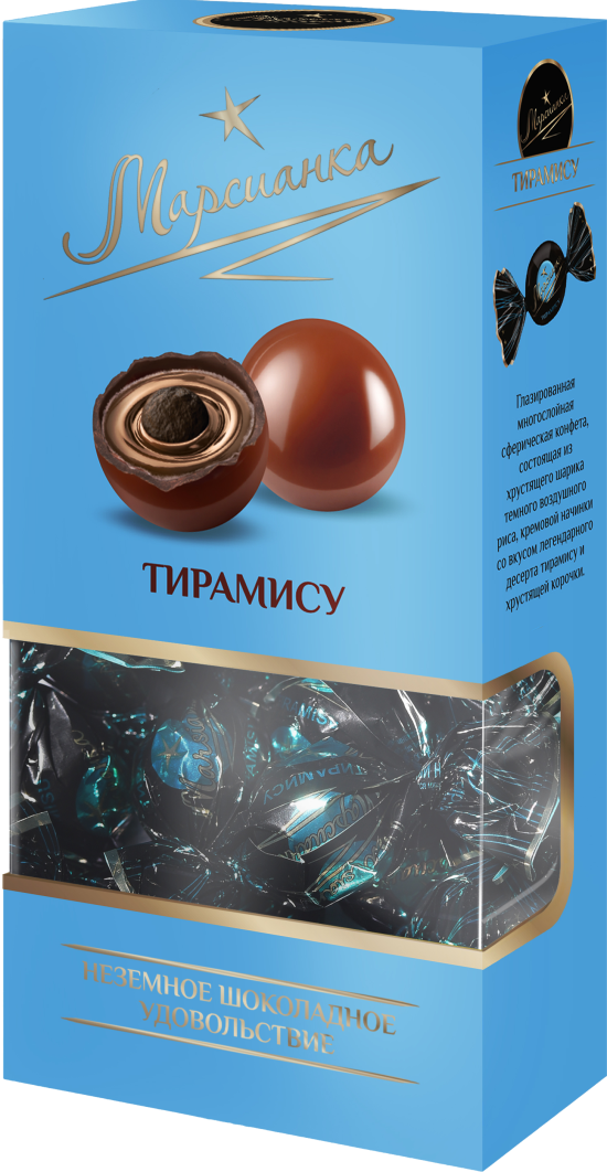 Конфеты с глазурью из темного шоколада, хрустящим корпусом из карамели, кофейно-шоколадным кремом со вкусом «Тирамису» и шариком из хрустящего воздушного темного риса внутри. «Марсианка» - концептуальный продукт фабрики. Его уникальность заключается в многослойности и вариациях вкусов. Покрытая глазурью идеальная сфера с хрустящим ядром и нежной начинкой – безупречное сочетание, которое делает эти конфеты поистине неземным удовольствием. При создании «Марсианки» кондитеры вдохновлялись вкусами мировых десертов – шедевров кондитерского искусства