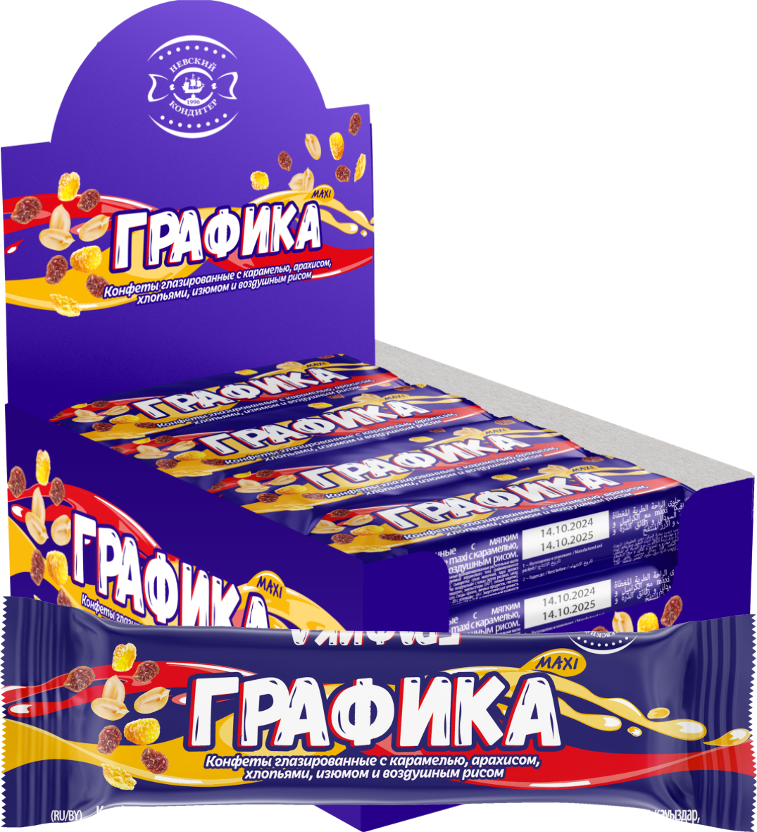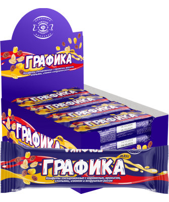 Батончик с мягкой карамелью, с арахисом, кукурузными хлопьями, изюмом и воздушным рисом