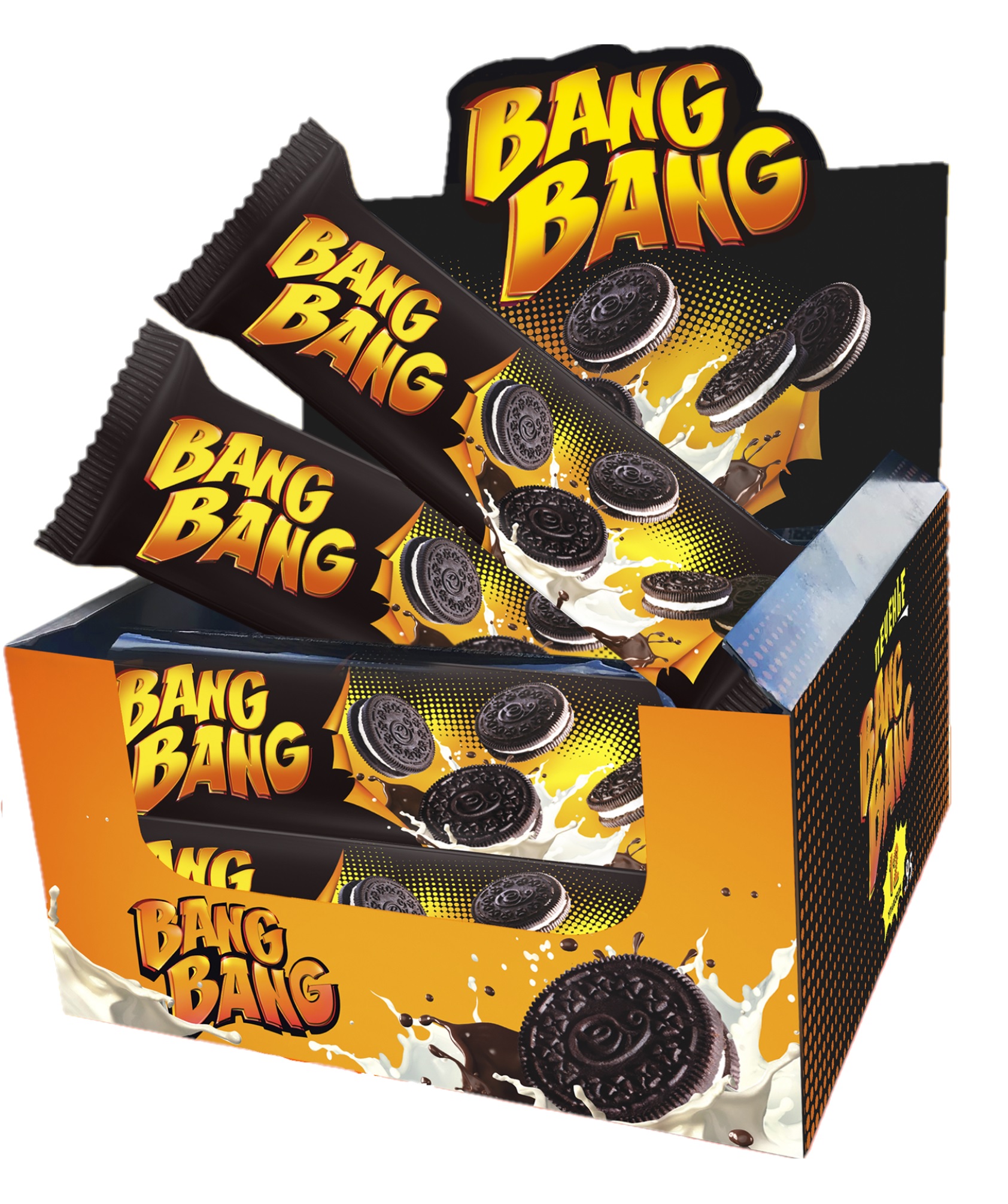 Шоколадное печенье-сэндвич "Bang Bang" с молочно-ванильной начинкой понравится и взрослым и детям. Для получения темного цвета печенья используется натуральный высококачественный голландский какао (не активированный уголь). Производится из натуральных ингредиентов, без добавления искусственных красителей. Поставляется в шоу-боксе, в шоу-боксе 12 шт., в коробе 4 шоу-бокса