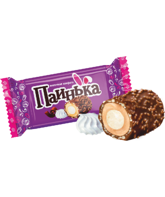Оригинальная конфета с зефирной начинкой в корпусе из пралине в молочной шоколаде и обсыпке из хрустящих шариков