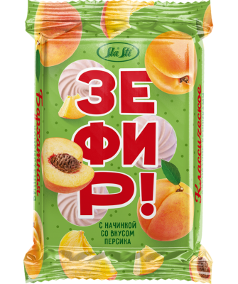 Зефир со вкусом персика с начинкой. Изготавливается из яблочного пюре с добавлением яичного белка, сахара и агар-агара, что позволяет сочетать максимально натуральный состав с традиционным классическим вкусом. Теперь начинки на 20% больше!