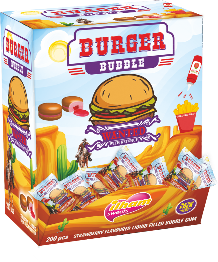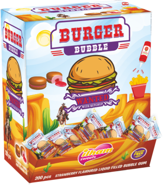 Жевательная резинка в виде бургера со вкусом клубники с жидким центром. Поставляется в шоу-боксе