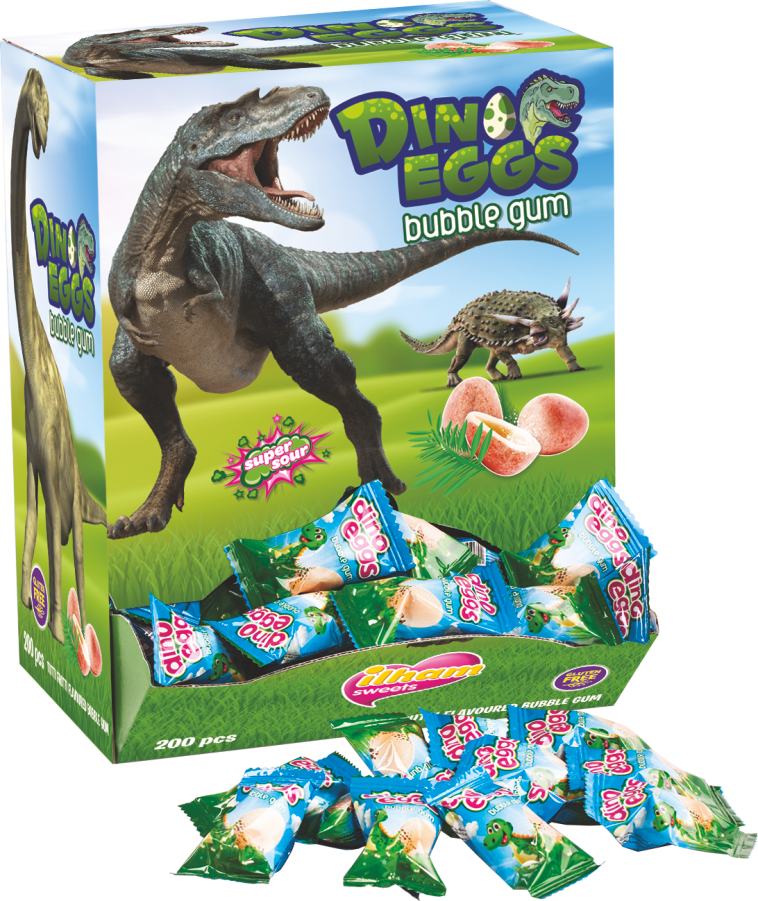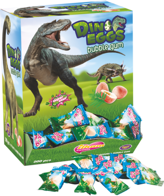 Жевательная резинка в виде яиц динозавра супер кислая со вкусом тутти фрутти. Поставляется в шоу-боксе